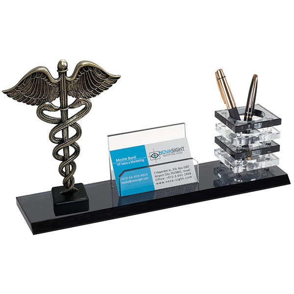 מעמד שולחני לעטים וכרטיסי ביקור ו" סמל הרפואה " - מתנה יוקרתית ומלאת השראה לאנשי הרופאה. המעמד בעצוב מרשים וכולל את סמלו הקלאסי של עולם הרפואה ( מטה אסקלאפיוס עם שני הנחשים וכנפיים) ובנוסף כולל מקום לעטים וכרטיסי ביקור. המעמד עשוי מקריסטל ומשדר יוקרה .