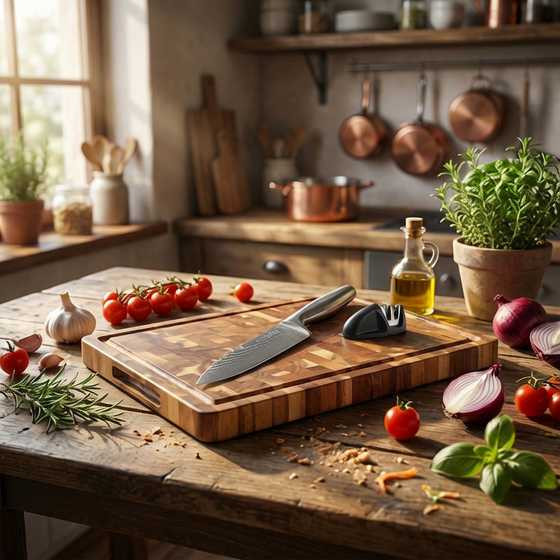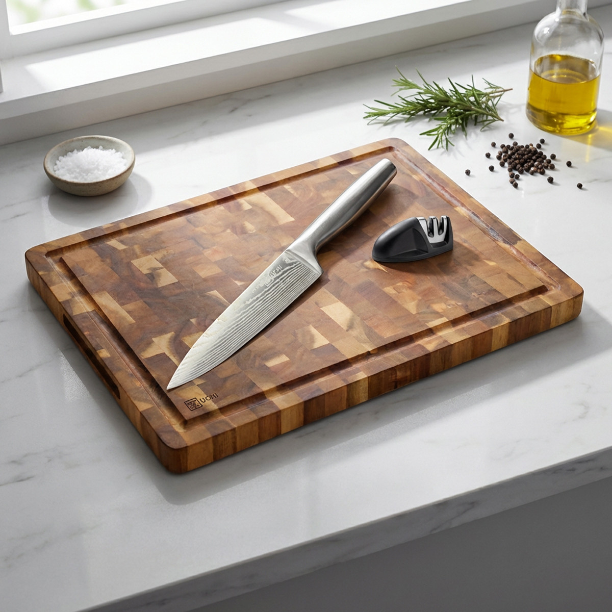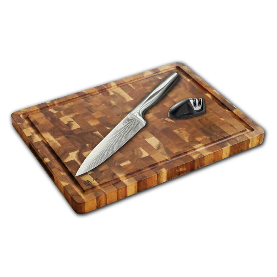 • לוח בוצ'ר מקצועי עם סכין שף ומשחיז.