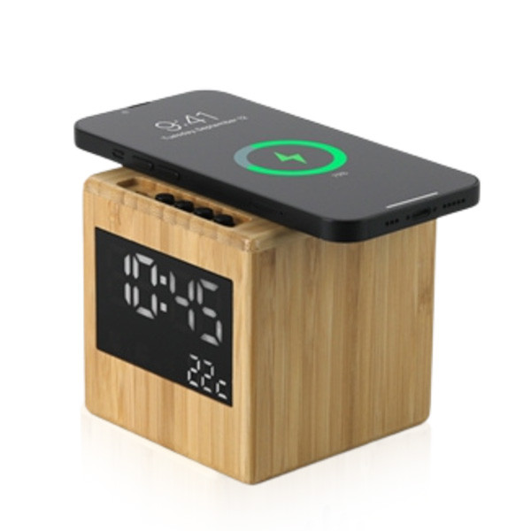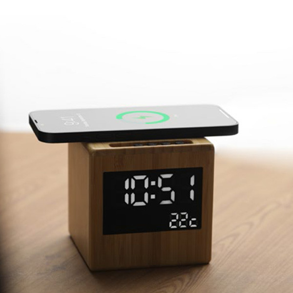 שעון קובייה מבמבוק עם טעינה אלחוטית - חכם , שימושי ומעוצב . השעון שלא רק מציג שעה ומעורר אותכם - אלא גם מטעין את הטלפון שלכם בטעינה אלחוטית + רמקול עם חיבור בלוטוס. שעון קובייה מבמבוק עם תצוגת LED ברורה וטעינה אלחוטית פתרון שימושי לכל שולחן וחדר שינה.